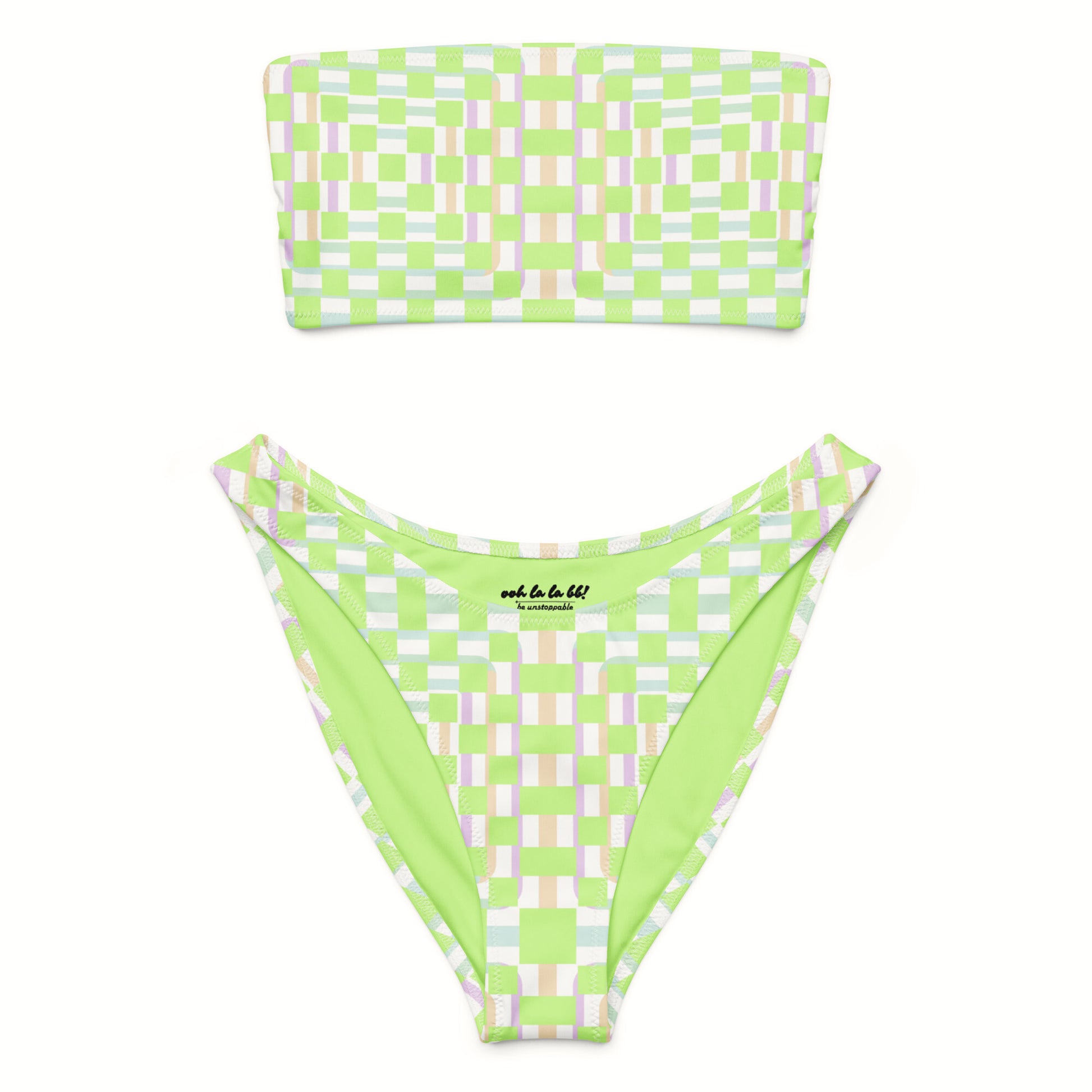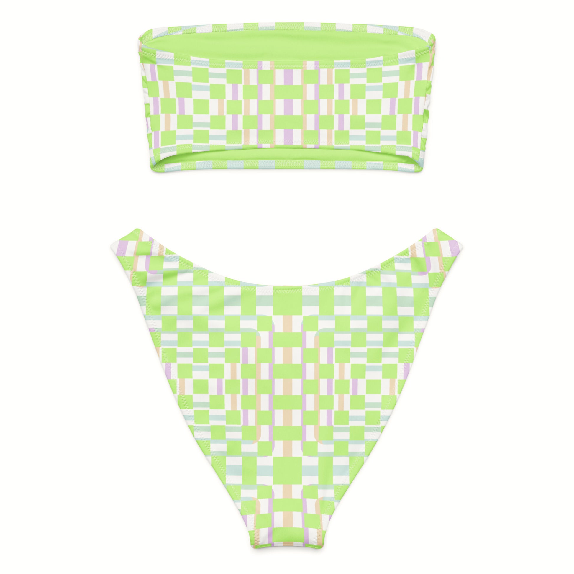 Its bold green checkered pattern—layered with soft pastel details on a clean white background—brings a playful yet sophisticated energy to the studio or the sun. Lightweight, soft, and freedom-focused, this set moves when you do.
