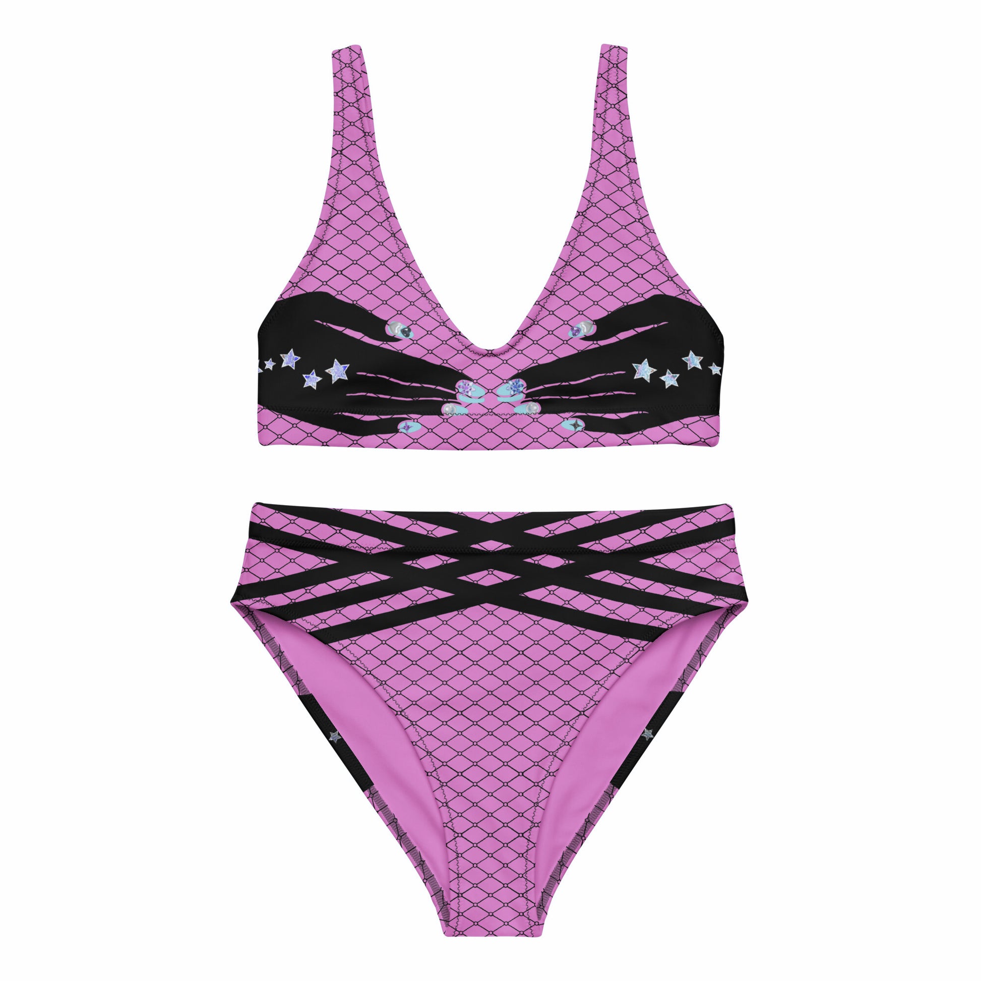 Step into style with our All Mine High-Waisted Bikini Set — playful, edgy, and full of personality. The padded top features the signature bejeweled hands design with sparkling stars, while the high-waisted bottoms mirror the motif on the back and showcase diagonal crisscross lines on the front over a fishnet-inspired background.