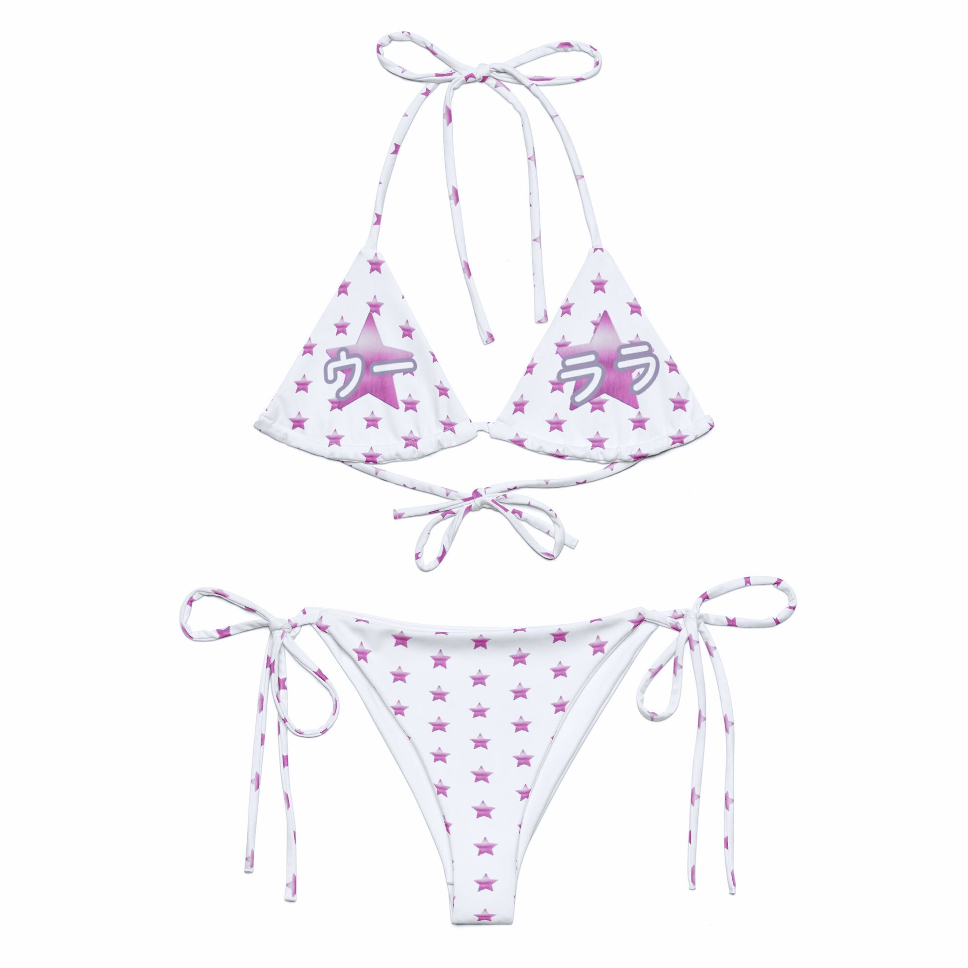 Make a statement in the Ooh RaRa String Bikini Set — playful, versatile, and full of personality. This white set features a pink star pattern, with two larger stars over the chest for a bold, fun touch. One cup displays “Ooh” and the other “RaRa” in elegant purple-gray kanji, adding a unique, artistic detail.